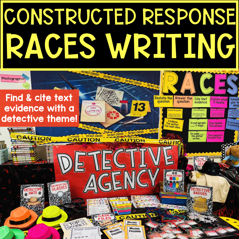 Writing doesn’t have to feel like a chore. One of my favorite ways to make the RACES strategy more engaging is by using a detective theme. I tell my students they’re “evidence detectives” on a mission to solve the case of a tricky reading question. Their job is to restate the prompt, answer it clearly, and then search the text for “clues” (aka evidence) to support their thinking. Framing writing as an investigation adds just enough excitement to hook even reluctant writers. I use themed anchor charts, student pages, and classroom visuals to build the detective vibe—and they love it. It turns something that could feel like hard work into a challenge they’re eager to complete. You don’t need to go all-out to make it memorable—a few themed materials can go a long way. It’s a great way to boost motivation while reinforcing the skills they need to succeed with constructed response writing.